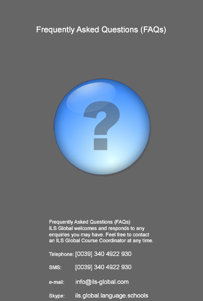 First, students should contact an ILS Global Course Coordinator: Click Contact to make an immediate On-Line enquiry or you can TEL: [0039] 340 4922 930 or alternatively you can send an SMS: [0039] 340 4922 930 containing your e-mail address. E-MAIL: ILS Global requesting Course Timetable Information, or SKYPE: ils.global.language.schools with your contact details. (Click for Skype.)
