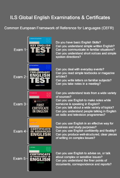 ILS Global International Language Schools encourage all students to prepare for: 1) KET (Key English Test), 2) PET (Preliminary English Test ), 3) FCE (First Certificate in English), 4) CAE (Certificate in Advanced English) and 5) CPE (Certificate of Proficiency in English) qualifications. ILS Global provides students with all they need to obtain these qualifications as quickly as possible.